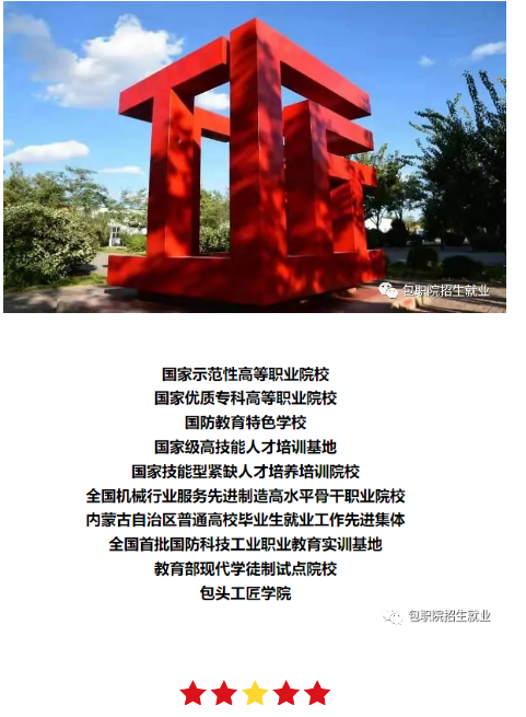 包头职业技术学院地处全国文明城市、草原钢城、稀土之都、内蒙古自治区重要工业城市——包头,是一所办学历史悠久,有着深厚职业教育底蕴的全日制公办高等职业院校。学院始建于1956年,前身是全国重点中专包头机械工业学校。1998年,学校升格建院,成为全国首批独立设置的高等职业技术院校,2008年获评国家示范性高等职业院校,2019年获评国家优质专科高等职业院校。