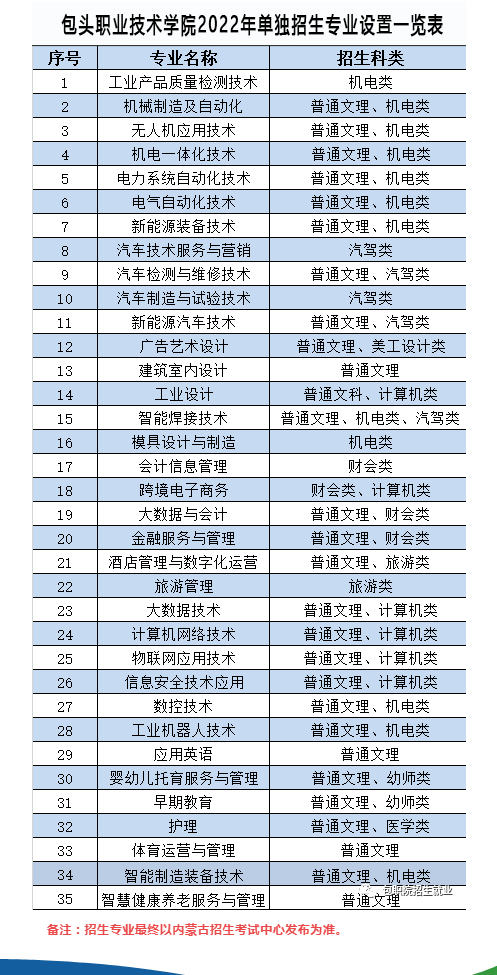 特别说明:学院首次征集志愿考试录取结束后,若完成单招计划,不再二次志愿征集;若单招计划有剩余,继续组织二次志愿征集考试录取工作,考试时间待定,将在学院招生信息网公布。因疫情原因,学院单独招生工作时间流程可能会变更调整,请及时关注包头职业技术学院招生信息网和包职院招生就业微信公众号(网址:http://btzyjsxyzs.university-hr.com/,公众号:bzyzsxx )。