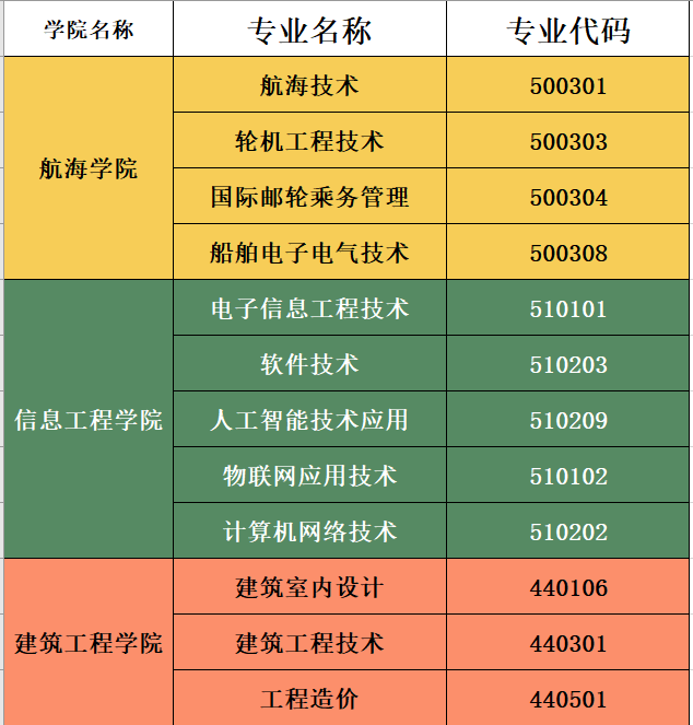 我校现设有机电工程学院、信息工程学院、建筑工程学院、航海学院、经管学院、艺术学院、 教育学院、护理学院等8个级学院和2个教学部。开设有航海技术、轮机工程技术、护理、学前教育、机电一体化技术、软件技术、物联网应用技术、大数据与会计、艺术设计、跨境电子商务等37个专业。