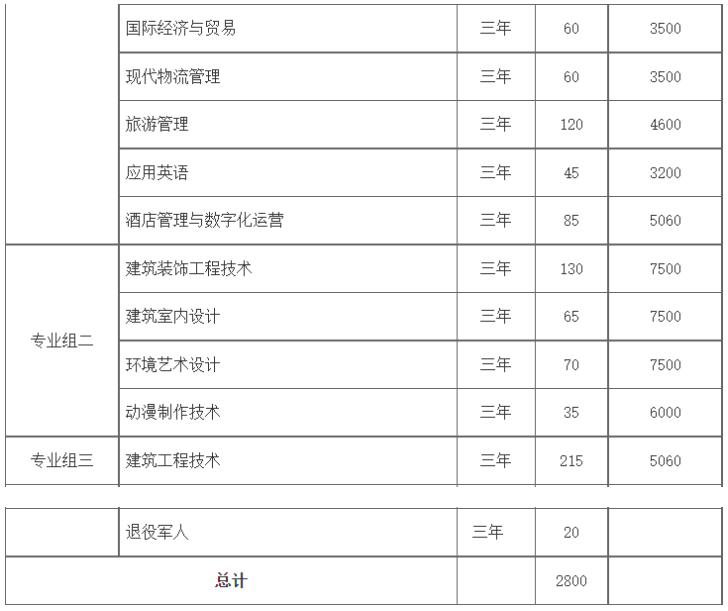 第十一条 我校2022年单招总计划为2800人,具体单招专业、计划和收费标准如下表。