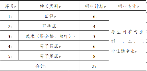 1.体育特长类考生:应、往届普通高中毕业生,有体育特长且具备以下条件之一:(1)获得国家二级运动员(含)以上等级证书;(2)高中阶段在省级(含)以上比赛中获得个人或集体项目(主力队员)前六名,或市级个人或集体项目(主力队员)前三名者。
