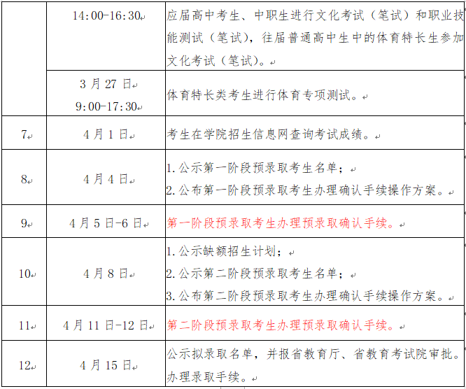 (六)学院4月4日在招生信息网上公布预录取名单,同步公布办理预录取确认手续的方案;已预录取的考生根据方案要求于4月5日-6日办理预录取确认手续,未在规定时间内办理预录取确认手续的考生,将视作自动放弃;预录确认后,如若出现招生计划空缺,将在网上公布缺额,仍按考生总成绩从高分到低分依次递补录取同一类别的考生,4月8日公布补录考生名单, 并于4月11日-12日办理确认手续。