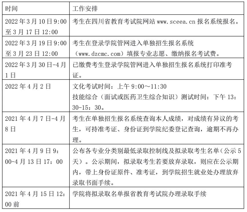 (二)学校确认:在四川省教育考试院网站报考我校的考生,应于2022年3月19日9:00至23日12:00,登陆我院官网www.dzcmc.com,进入单独招生报名系统,按要求填报1个专业志愿及其它相关信息。信息确认无误后,考生再通过单独招生报名系统缴纳报名考试费130元。在规定时间内未通过报名系统完成专业志愿确认和缴费的考生,学院视为自动放弃单独招生报名资格。报名考试费缴纳后,不予退费,网上缴费说明在单招报名系统里。