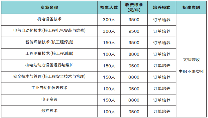 2.订单培养模式:学校与中核集团下属成员单位共同制定当年招生计划、共同制定人才培养方案;互派师资、让核电专家走进课堂、让学校教师进企业实践;专业设置与行业需求对接,岗前培训前移到学校,实现学生与企业无缝衔接。