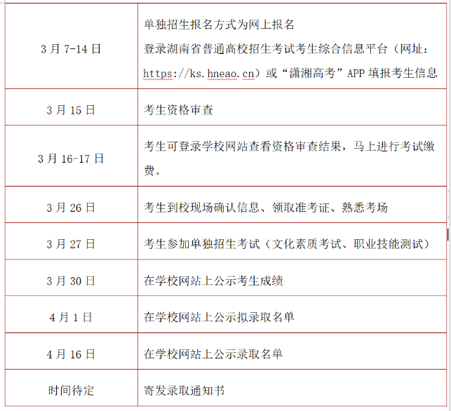 第十一条 退役军人资格证明材料提交:2022年3月7日前完成资格审核,携带本人身份证、湖南省2022年高职单招报名身份界定表及相应资格证明材料到招生就业指导处办公室办理资格确认手续。不能提供有关证明材料的考生只能以普通往届生身份报考。