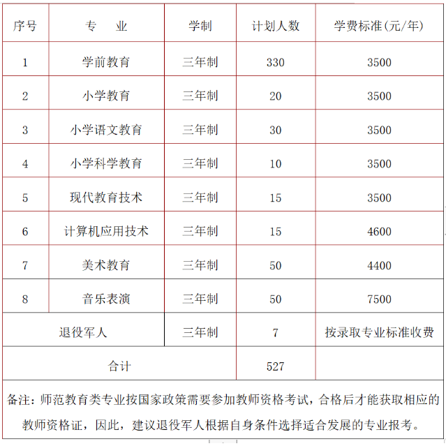 第六条 单独招生专业设置:学前教育、小学教育、小学语文教育、小学科学教育、现代技术教育、美术教育、音乐表演、计算机应用技术等8个专科专业,面向湖南省招生总计划527人。(各专业最终学费标准以2022年湖南省物价主管部门审核为准;所有专业均不限招生科类,即物理类、历史类、职高对口类考生均可报考)