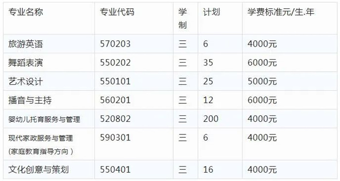 学校现有全日制在校生6000余人,设有学前教育、早期教育、小学语文教育、小学英语教育、旅游英语、音乐教育、舞蹈教育、舞蹈表演、美术教育、艺术设计、播音与主持、婴幼儿托育服务与管理、现代家政服务与管理、文化创意与策划等14个专业。其中学前教育被认定为国家骨干专业;学前教育、音乐教育专业被列为中央财政支持专业;学前教育、小学语文教育、美术教育专业被评为山西省高职高专特色专业;早期教育、舞蹈教育被评为山西省重点专业;语文教育、早期教育被评为山西省骨干专业;学前教育专业被评为山西省高水平重点专业;早期教育被评为山西省高水平实训基地。