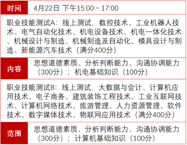 分类考试招生实行“文化素质+职业技能”的考试评价方式。学业水平考试成绩或文化素质测试成绩合格者,参加我校组织的职业技能测试(或职业适应性测试),其中普通高中毕业生参加职业适应性测试,中职毕业生参加职业技能测试。退役军人、下岗职工、农民工、高素质农民等社会群体考生,根据中等教育阶段毕业类型,参加我校织的职业技能测试(或职业适应性测试)。