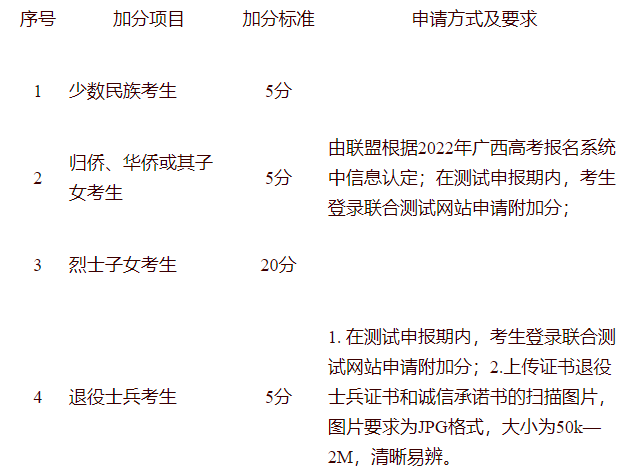 说明:①表中加分项仅适用于本次联盟院校的高职单招联合测试;②同一考生符合多项加分条件的,只按其中最高一项加分分值计入总分。