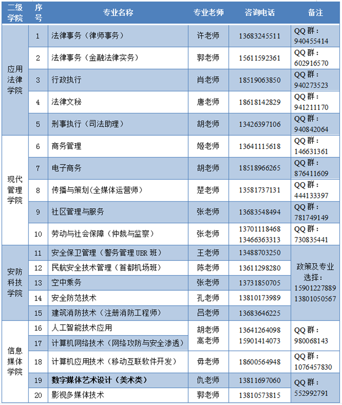 学院设有应用法律学院、现代管理学院、安防科技学院、信息媒体学院、基础学院和马克思主义学院,开设24个专业,全日制在校生3500人。学院有优良的教师队伍,其中北京市优秀教师3人,北京市教学名师4人,职教名师1人,北京市专业带头人3人,北京市师德先锋5人, 青年英才5人,优秀青年骨干教师24人,创新团队2个。教授、副教授占比超过40%,专业课教师中双师素质教师占比超过80%。