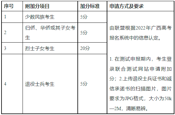 说明:①表中附加分项目及加分标准仅适用于本次联盟院校的高职单招联合测试;②同一考生符合多项加分条件的,只按其中最高一项加分分值计入总分。