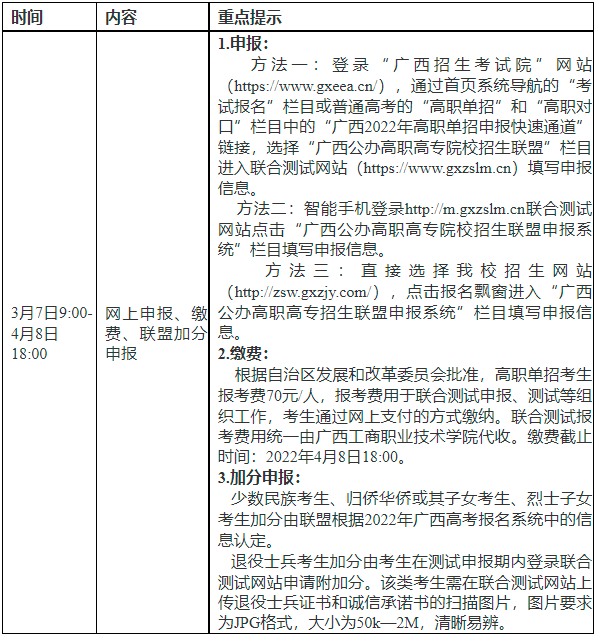 经自治区发展和改革委员会批准,高职单招考生报考费70元/人,报考费用于联合测试申报、测试等组织工作,考生通过网上支付的方式缴纳。联合测试报考费用统一由广西工商职业技术学院代收。缴费截止时间:2022年4月8日18:00。