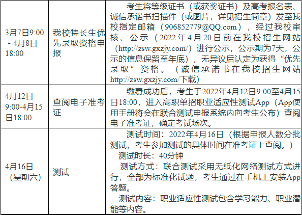 (1)2022年3月7日9:00至4月8日18:00期间,考生将等级证书(或获奖证书)及高考报名表、诚信承诺书扫描件(或图片)发至我校指定邮箱(906852779@QQ.com),经过我校审核、公示(2022年4月20日前在我校招生网站(http://zsw.gxzjy.com/)进行公示,公示期为7天,公示的信息保留至年底),无异议后认定为获得“优先录取”资格。(诚信承诺书在我校招生网站http://zsw.gxzjy.com/下载)其中,参加了广西2022年普通高校招生体育类、艺术类统考且无相关等级或获奖证书考生的术科成绩由自治区招生考试院统一提供,无需提交相关材料。
