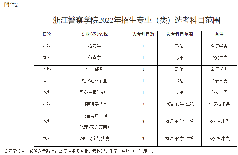2.浙江警察学院2022年招生专业(类)选考科目范围