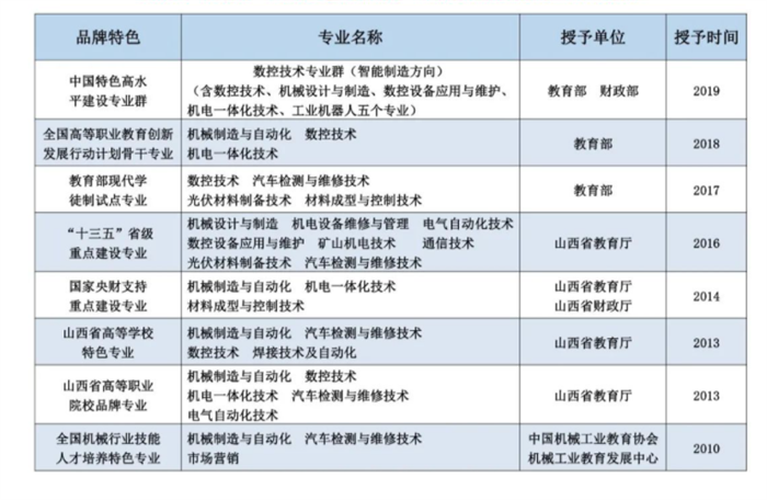 师资队伍一流:现有1个“全国高校黄大年式教师团队”和3个省级优秀教学团队。有教授12名,副高级职称教师72名,其中双师素质教师比例占86.39%,具有硕士学位的教师比例占84.44%。有国家“万人计划”教学名师1名,省级“双师型”教学名师3名,省级“双师型”优秀教师16名,入选2018年度山西省“三晋英才”支持计划拔尖骨干人才9名,“山西省五一劳动奖章”获得者2名,“三晋技术能手”获得者14名,省高校工委、省教育厅联系的高级专家9名,全国机械职业教育教学指导委员会副主任委员、委员11名,山西省中小企业技术创新专家9名,山西省科技厅专家库专家5名,山西省职业教育专家库专家14名。