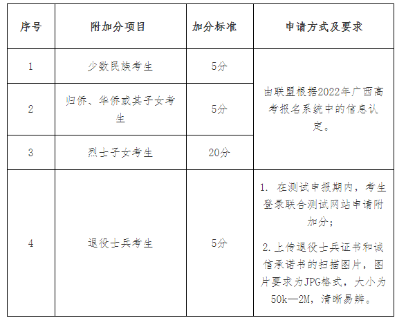 说明:①表中附加分项目及加分标准仅适用于本次联盟院校的高职单招联合测试;②同一考生符合多项加分条件的,只按其中最高一项加分分值计入总分。