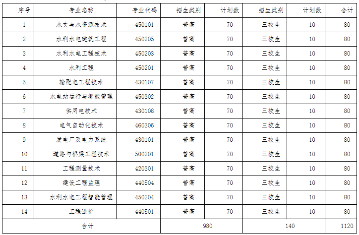 云南水利水电职业学院2022年单独招生预计安排1120人,其中980人为普高生,140人为三校生。(最终招生专业和计划数以省教育厅审核公布的为准)