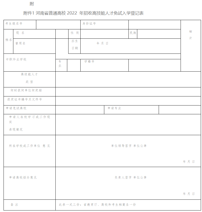 1.考生本人在规定时间内填写《河南省普通高等学校招收技
