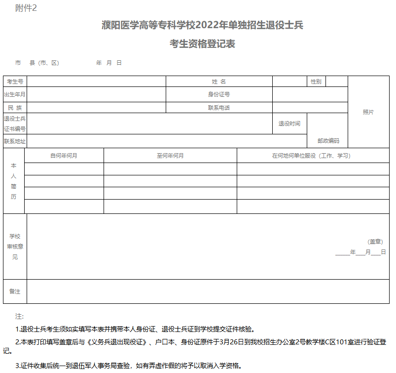 3、按照省教育厅文件要求,退役士兵资格审核贯穿全过程,审核合格退伍士兵免文化素质考试,按高中生学业水平测试A级计算,参加学校组织的职业适应性测试。(退伍军人需提填写审核表附件2,)提交时间为3月26日上班时间(上午08:00-11:30,下午14:30-17:30),逾期不再接收。