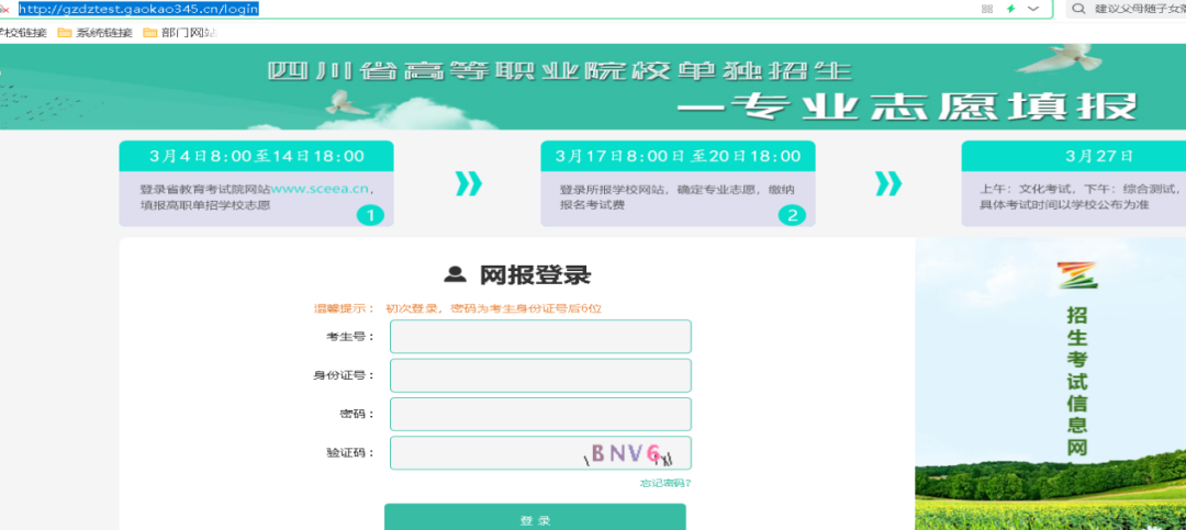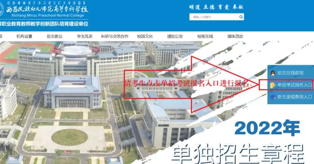 登录西昌民族幼儿师范高等专科学校官网(http://www.xcmzyz.com)进入单招考试报名入口,如下图所示。