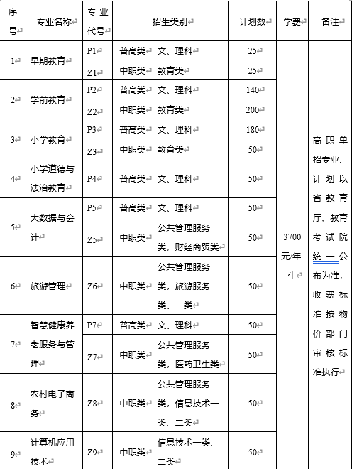 学校现有“四系两部”(学前教育系、小学教育系、艺术教育系、职业教育系、思政课程教学部、基础教学部),开设有学前教育、小学教育、小学道德与法治教育、智慧健康养老服务与管理、计算机应用技术、幼儿保育(五年制)等14个专业,在校学生6500余人。