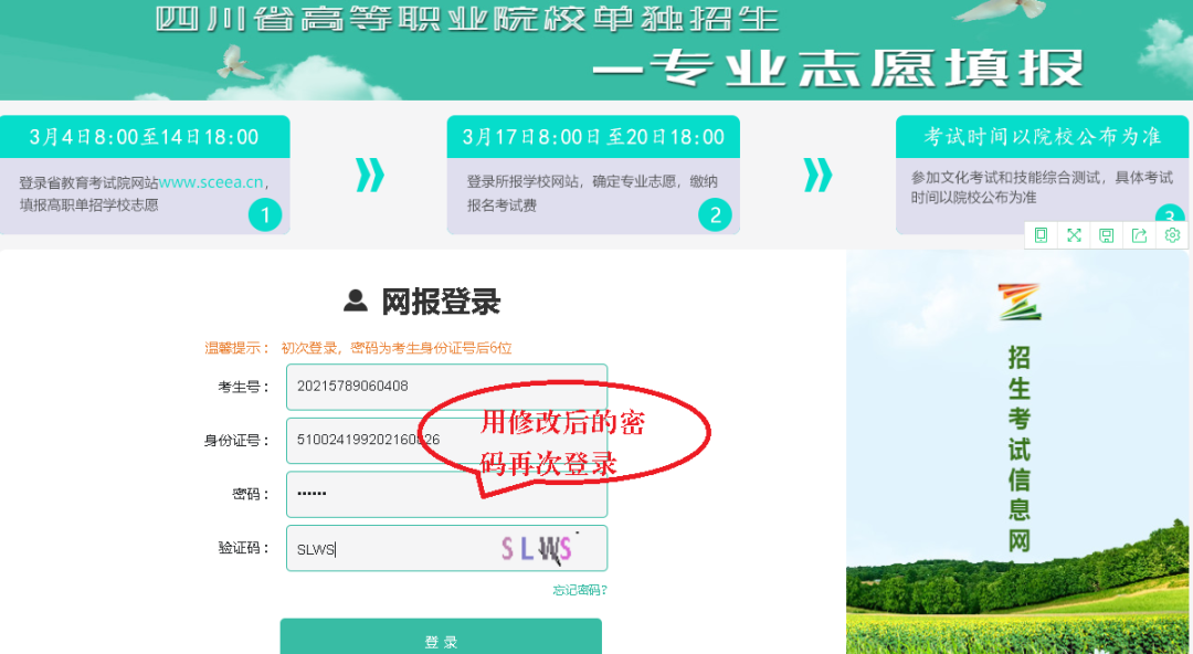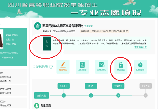 符合报考条件的考生本人应于2022年3月10日09:00至17日12:00,登录省教育考试院网站(http://www.sceea.cn),按要求准确填写相关信息,填报西昌民族幼儿师范高等专科学校为单招学校志愿。考生须在规定的时间内完成网上填报志愿并提交确定。逾期不再补报。如因考生本人疏漏或失误造成的后果,由考生本人承担。