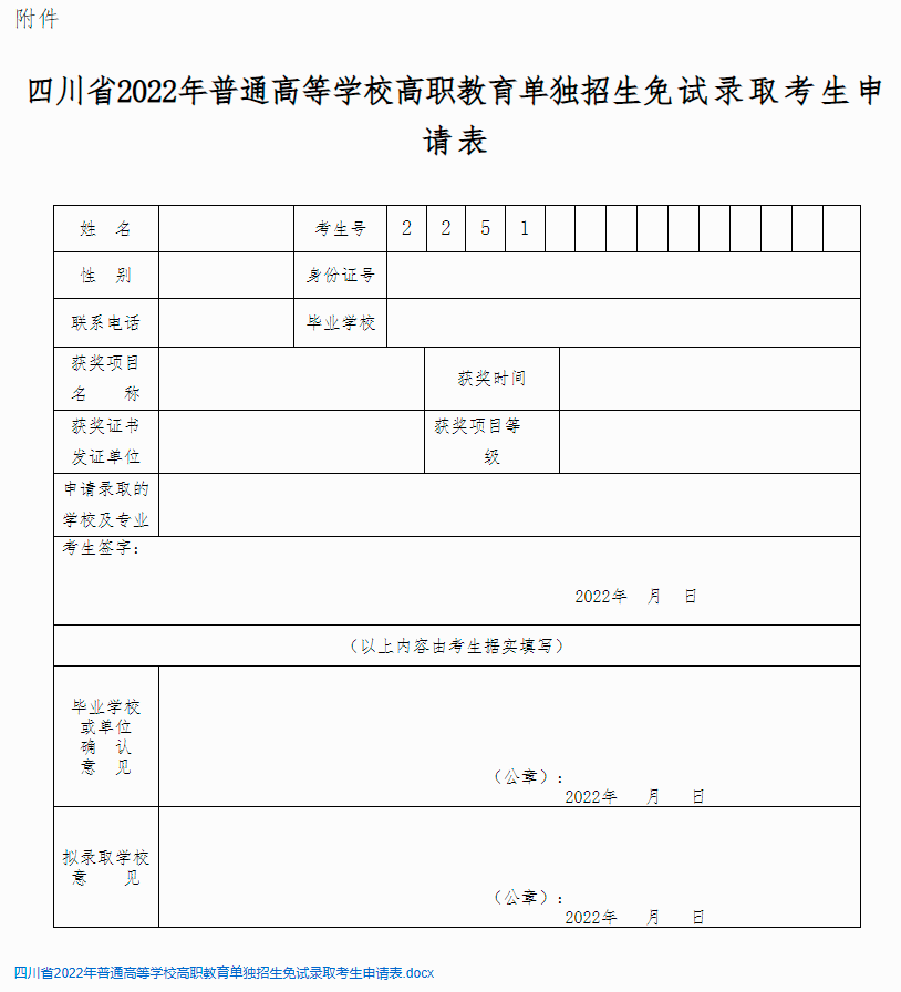 附件:四川省2022年普通高等学校高职教育单独招生免试录取考生申请表
