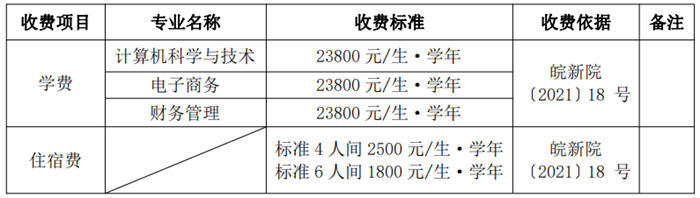 (三)学费标准:根据安徽省物价局、省教育厅皖价费〔2017〕56 号、皖价费〔2018〕70 号、教育部等五部门教财〔2020〕5 号等文件精神,结合我校实际,2022级新生学费及住宿费收费标准(皖新院〔2021〕18号)如下: