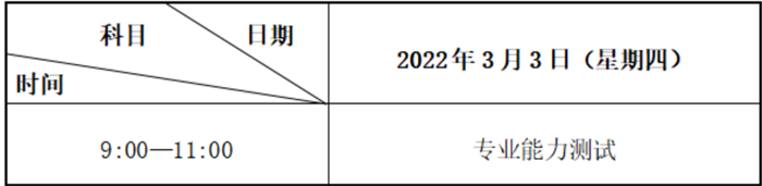 首轮全省统一专业能力测试时间为2022年3月3日。具体测试时间与测试科目安排如下(北京时间):