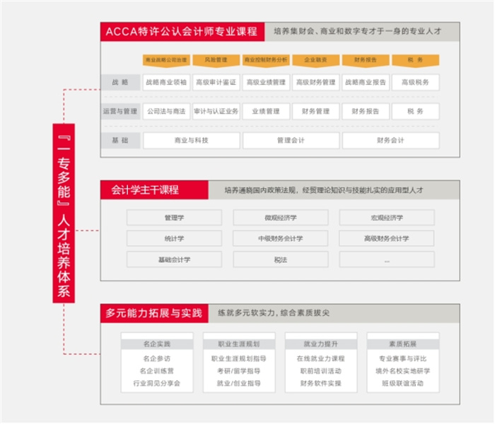 本专业在保留会计学专业主干课程基础上,将ACCA课程与会计学专业部分课程进行了有效替换和补充,并为会计学专业(ACCA方向)单独设置了贯穿大学四年全程的丰富多元能力拓展与实践活动,形成了特色鲜明的“一专多能”人才培养体系。