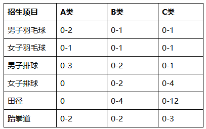 各项目分小项或位置按照A类、B类、C类的顺序依次进行优惠等级认定。当某一项目A类、B类或C类拟签约生源不足时,该项目A类签约名额可依次调整到女子羽毛球、男子羽毛球、男子排球、跆拳道,该项目B类或C类签约名额可依次调整到田径(项目队顺序依次为投掷、跳跃、中长跑、短跨)、女子羽毛球、男子羽毛球、男子排球、跆拳道、女子排球。