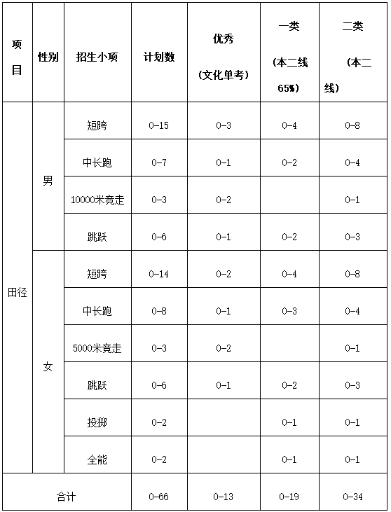 我校高水平运动队招生规模在我校上一年度招生计划总数的1%以内,招生总计划不超过66人。公示合格考生人数按教育部规定执行,根据测试情况,择优录取,宁缺毋滥。若某项目符合认定条件考生不足时,则其计划取消或调至其他项目。招生项目及计划数见下表: