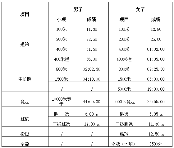 (六)考生高中阶段获得的比赛成绩或运动员等级证书中的成绩须满足招生相关小项的报名起点成绩(下表中未列出的小项不招生):