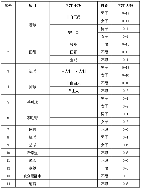 备注:因受运动项目生源质量和数量不确定的限制,本次公布的运动项目招生名额均为拟定名额。最终各项目招生名额,将综合考虑各运动项目生源情况、学校运动队需要等因素于录取前再行公布。