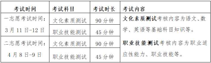 备注:1、文化素质测试满分为100分,职业技能测试满分为100分。
