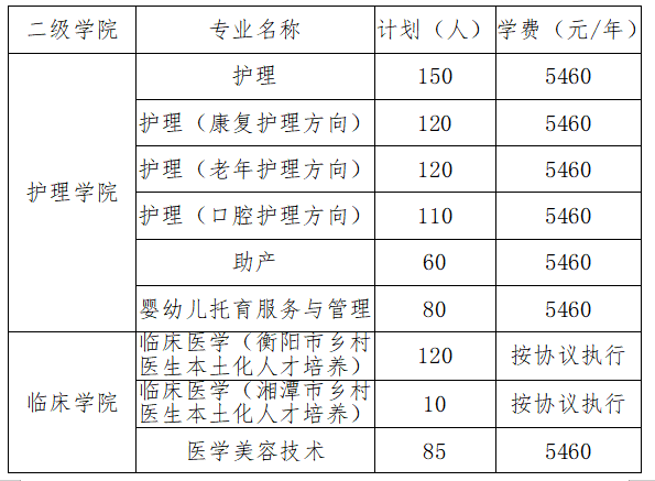 第八条 学校根据优化生源结构、促进入学机会公平、保持数量基本稳定的原则,确定我校临床医学(衡阳市乡村医生本土化人才培养和湘潭市乡村医生本土化人才培养)、预防医学、口腔医学技术、眼视光技术、医学美容技术、护理、护理(康复护理方向)、护理(老年护理方向)、护理(口腔护理方向)、助产、婴幼儿托育服务与管理、药学、中药学、医学检验技术、康复治疗技术、智能医疗装备技术、卫生信息管理、医学影像技术、医疗器械维护与管理、老年保健与管理等20个专业(含方向)均进行单独招生。
