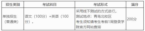 参加单独招生的退役军人类考生不参加文化素质考试与专业技能测试,只进行素质测试。素质测试时间为2023年2月27日,采用线下测试的方式进行,测试地点:青岛北校区,测试内容:素质测试(200分),考生须知请考生考前1周登录学院官方网站查询。