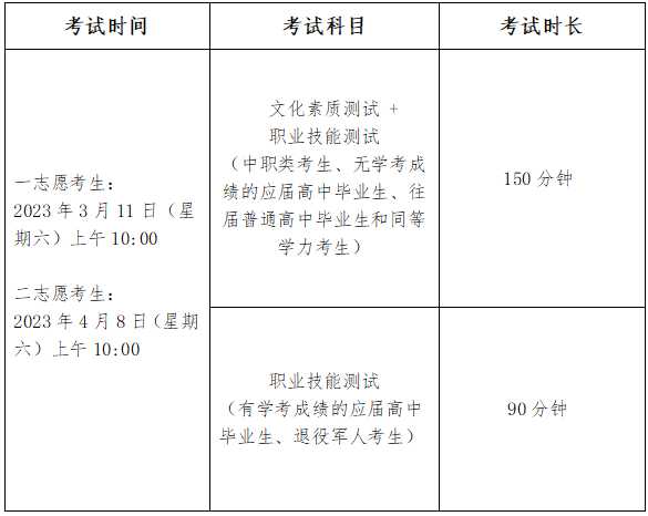 填报我院一志愿考生考试时间为:2023年3月11日,考试结束后立即进行录取,如我院单招计划未完成,将组织填报我院二志愿的考生进行考试,考试时间为:2023年4月8日。如因疫情等原因确需调整考试时间将另行通知。