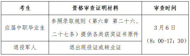 第十六条 考生进行资格审查时请携带本人身份证(应届中职生资格审查可由家长携带考生身份证代理)、湖南省2023年高职单招报名身份界定表及相应资格证明材料到我校招生就业处1009办公室办理审查确认手续。资格审查时间及需提供的相应资格证明材料要求如下: