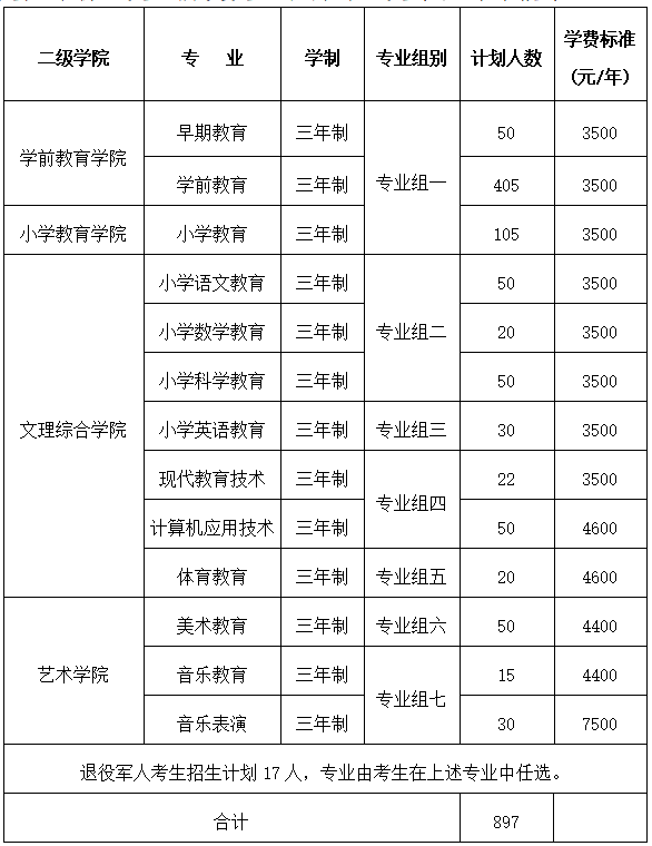 第六条 单独招生专业设置:早期教育、学前教育、小学教育、小学语文教育、小学数学教育、小学英语教育、小学科学教育、现代教育技术、计算机应用技术、体育教育、美术教育、音乐教育、音乐表演等13个专科专业,面向湖南省招生总计划897人。(各专业最终学费标准以2023年湖南省物价主管部门审核为准;所有专业均不限招生科类,即物理类、历史类、职高对口类考生均可报考)