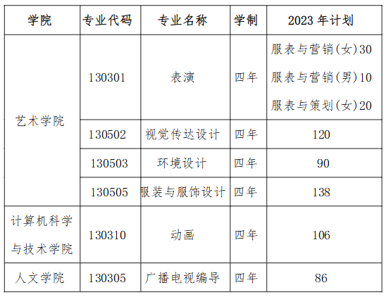 学校2023年设计学类(视觉传达设计、环境设计、服装与服饰设计、)总计划348名;表演专业计划60名;广播电视编导专业计划86名;动画专业计划106名。