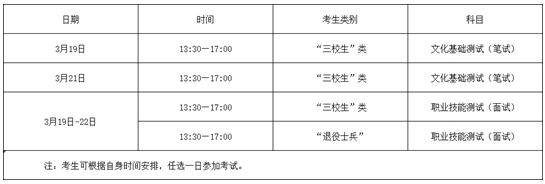 (二)职业适应性和职业技能测试:普通高中毕业生:职业适应性测试由各专业综合素质测试考评专家组逐一进行面试,主要测试考生的职业兴趣、职业道德修养、表达与思考能力、分析判断能力等综合素质,经测试小组评议后给出综合成绩。三校生:职业技能测试以教育部发布的中职专业教学标准中的核心知识为基本依据,采用笔试,重点考察综合专业能力;技术技能测试以教育部发布的中职教学标准中核心技术技能为基本依据,以操作考试为主,充分体现岗位技能、通用技术等内容。