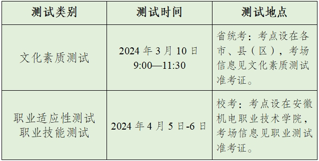 所有考生均须参加省教育招生考试院统一组织的文化素质测试。文化素质测试内容参照《安徽省普通高校分类考试招生和对口招生文化素质测试考试纲要》执行,测试包括语文、数学、英语三科内容。卷面分值为300分,其中语文、数学120分,英语60分。采取合卷笔试的方式进行考试。