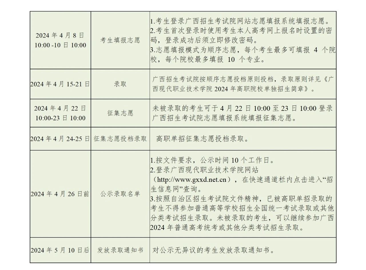 为切实做好我校2024年高职院校单独招生(以下简称高职单招)工作,根据《教育部办公厅关于进一步完善高职院校分类考试工作的通知》(教学厅函〔2021〕36 号)和《自治区招生考试院关于做好我区2024年高职院校分类考试招生工作的通知》(桂考院〔2023〕227号)文件精神,结合我校招生工作实际,制定我校2024年高职单招简章。具体内容如下: