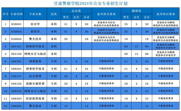 报考公安专业的考生,须为参加甘肃省2024年普通高等学校招生全国统一考试、且具有甘肃省户籍的普通高级中学毕业生,女生比例不超过15%。