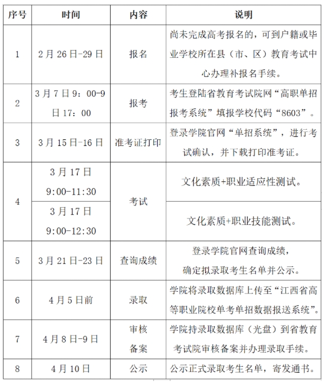 报考方式:考生自行登录江西省教育考试院网站(网址:www.jxeea.cn)“高职单招报考系统”,按照网页提示的流程操作,选报我院院校代码8603,先选择专业组代码再选择不超过6个专业和是否服从专业调剂,学校将按考生填报的专业组代码分类组织测试。联系方式:0791-83899638。