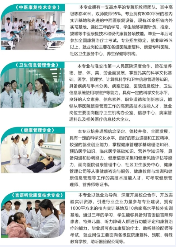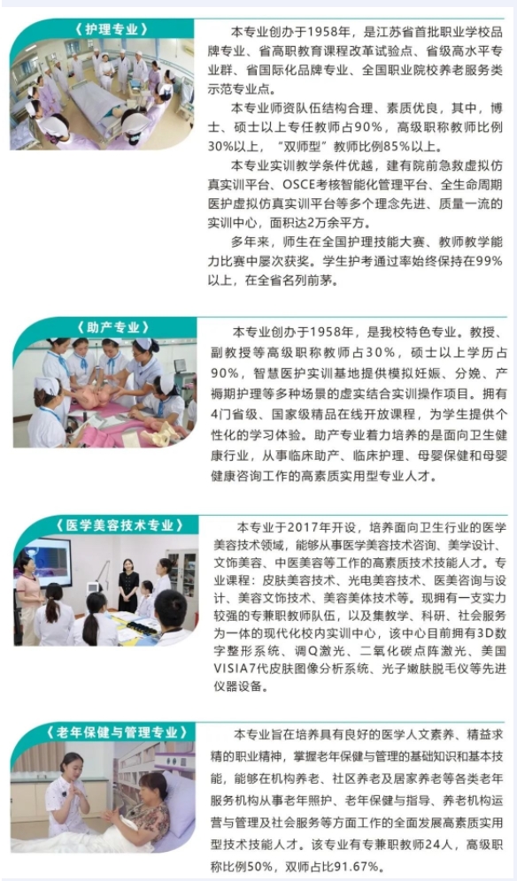 学校设有黄河路和科技路两个校区,共占地800余亩,其中科技路校区由中国工程院院士、东南大学王建国教授主创规划设计,先后获评全国优秀建筑设计一等奖和教育部优秀工程设计一等奖。现有全日制在校学生8000余人,专任教师400余人,其中硕士及以上学位占比75.46%,“双师”型教师占比85.36%,省“333高层次人才”“青蓝工程”等省级人才18人,与南京医科大学、徐州医科大学、南京中医药大学等高校联合举办“3+2”高职本科现代职教体系贯通培养项目。拥有护理、中医学、预防医学、助产、康复治疗技术、医学检验技术、药学等20个专业,其中护理专业被省教育厅立项“国际化人才培养品牌专业建设项目”,获评江苏省首批品牌专业、省级高水平专业群。护理实训中心先后被评为江苏省职业教育优秀实训基地、中央财政支持实训基地建设项目、省教育厅示范性虚拟仿真实训基地建设项目。拥有省工程中心、省社科普及基地2个省级科研平台,以及校地合作共建的千亩药材产业园。建有融教学实训、课程思政、职业体验、社会培训、健康宣教等多功能的跨界融合、跨专业整合、信息化契合、全国一流的智慧医护实训中心。